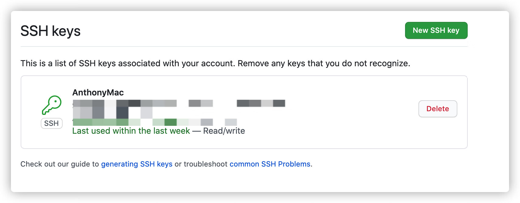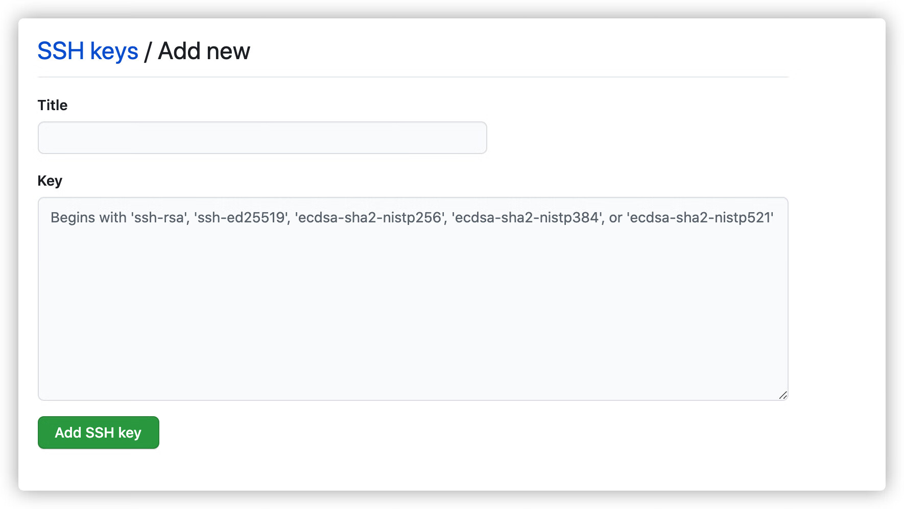 登录github,配置SSH,在下方截图那里新建一个title,同时将生成的公钥复制到Key输入框里面,确认无误以后点击add
