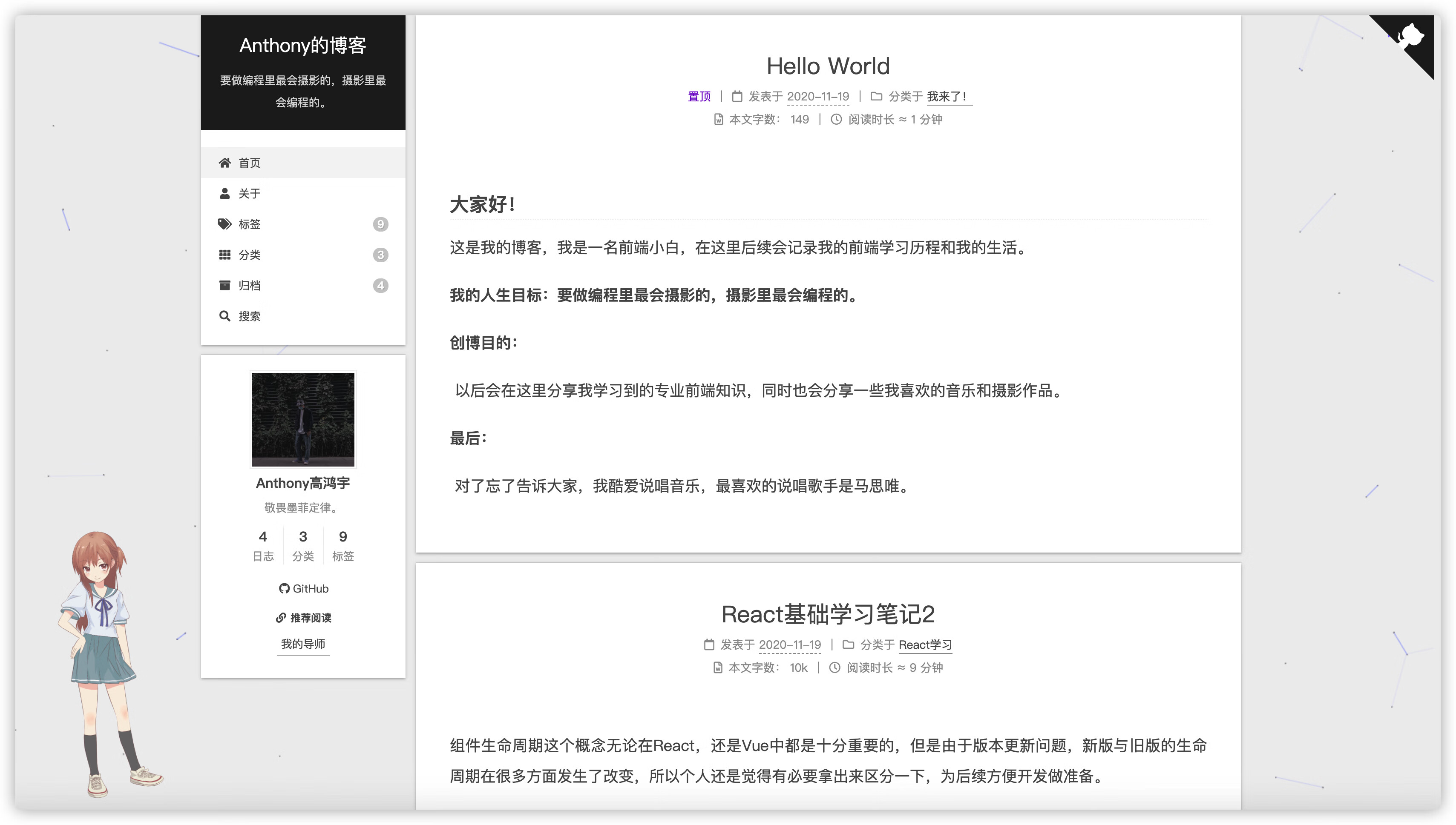 作为一名程序员,拥有一个自己的博客是十分重要的一件事,程序员需要将自己的知识进行沉淀并进行记录是一个十分好的习惯。日常读别人的博客时,看到一些很优秀的博客经常会很羡慕。内心也有着自己想做一个自己博客的冲动。关于创建博客的好处这里就不用多说了,首先秀一下我的博客。